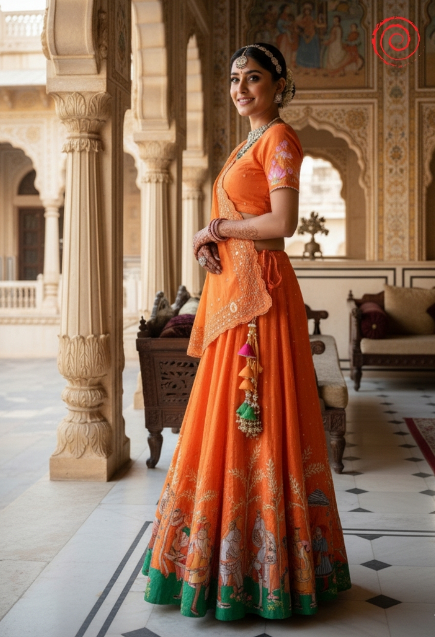 Like the Warmth of the Desert Sun, Kesariya Glows in Pumpkin Orange – Hand-painted With Love and Speckled With Sequins. A Celebration of Indian Art in Motion.