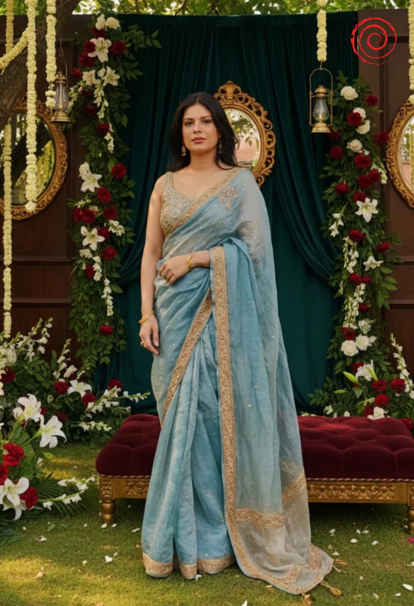Soft as Prayer, Shucker Glows in Sky-blue Tissue Organza With Fine Zardozi Embroidery. An Ethereal Piece That Embodies Grace and Gratitude.